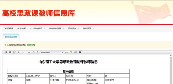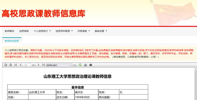 信息简报:可看到本校在全国高校的情况。 二、个人信息修订:点击“个人信息修订” 信息填报直接关系本校思政课教师队伍建设排名情况,也反映教师本人在整个教师队伍中的发展结果情况。今后将择机定期发布。请老师认真逐项填报,如实填写。弄虚作假会直接导致排名大幅降低。相应项目发生变化请及时更新。