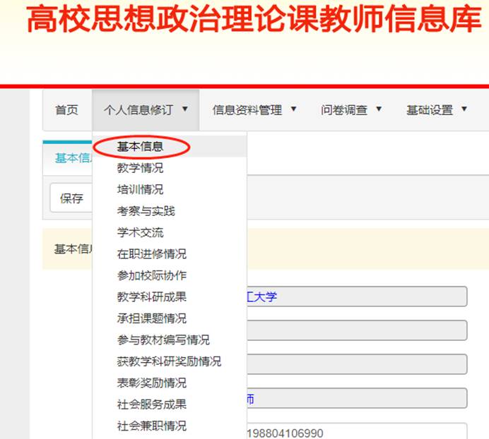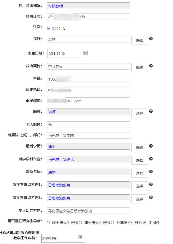注意事项:以下选项为必填项。漏填或者不填不能保存。请检查填写是否内容和格式是否正确,特别是“出生日期”、“最后学历”、“开始从事思想政治理论课教学工作年份”。 填写不正确或者漏填显示红色。学校管理员不能进行数据上报。固定电话可以填写本单位、本部门的办公电话。 如遇到手机号被占用,无法保存。这种情况的出现一般有以下三个原因:一是自己作为兼职教师已经在别的学校,特别是独立学院登录过手机号。二是自己是从别的学校调过来的,自己手机信息已存在原高校库中。三是自己的信息在本校以错误方式重复登录过。 处理办法是联系信息原登录高校管理员,将自己设为不在岗,禁止登陆,然后删除该用户。