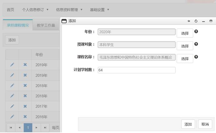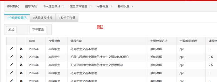 2.教学情况 (1)此项目为必填项。漏填或错填显示本人信息显示红色不完整状态。根据图示选择“添加”按钮,因此选择相应课程及教学信息,填写完毕,点击页面右下角“确定”按钮保存。依次增加“必修课程情况”“选修课程情况”、“教学工作量”。