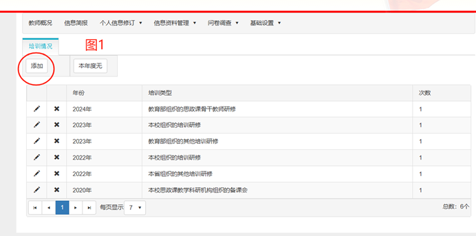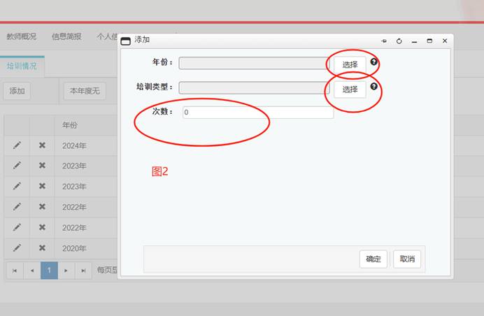 3.培训情况:个人信息修订-培训情况 请根据实际参加情况依次填写,填写后请保存。图1和图2:“添加”-选择年份-培训类型-填写次数-确定。