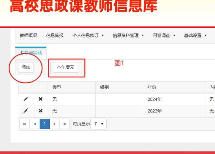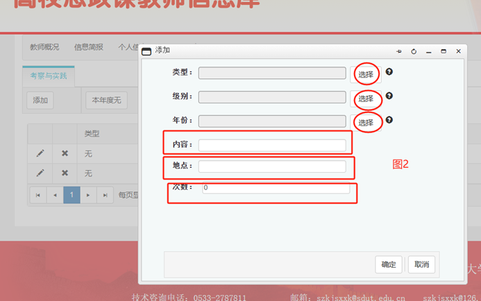 如本年度尚未参加培训,点击“本年度无”。 4.考察与实践 请根据实际参加情况依次填写,填写后请保存。图1和图2,添加-选择类型-选择级别-选择年份-填写内容-填写地点-填写次数-确定。