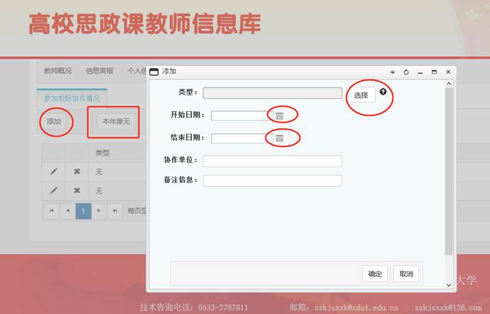 7.参加校际协作 请根据实际参加情况依次填写,填写后请保存。添加-选择年份-选择日期-填写协作单位-备注信息-确定。
