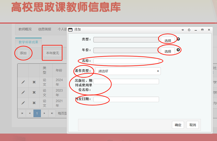 8.教学课程成果 请根据实际参加情况依次填写,填写后请保存。添加-选择类型-选择年份-填写名称-著作类型-出版社-刊发日期确定。