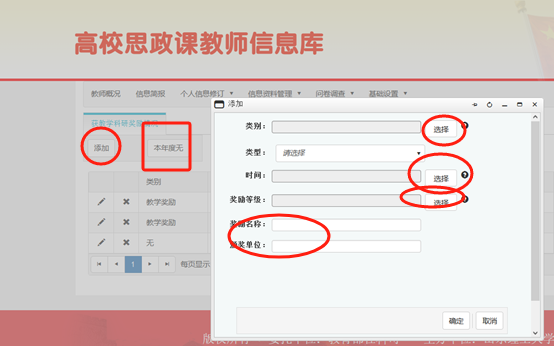 11.获教学科研奖励情况 请根据实际参加情况依次填写,填写后请保存。添加-选择类别-类型-时间-奖励等级-填写奖励名称-颁奖单位-确定。