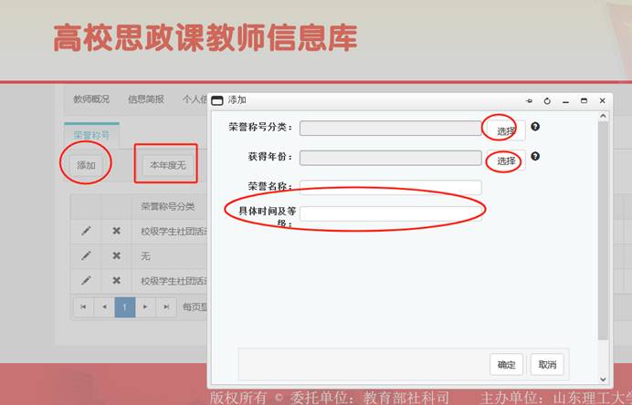 如本年度没有,点击“本年度无”。 12.表彰奖励情况 请根据实际参加情况依次填写,填写后请保存。添加-选择荣誉称号分类-获得年份-填写荣誉名称-填写具体时间及等级-确定。
