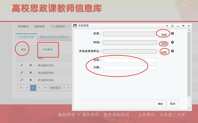 如本年度没有,点击“本年度无”。 13.社会服务成果 请根据实际参加情况依次填写,填写后请保存。添加-选择类型-时间-参加或使用单位-填写名称-次数-确定。