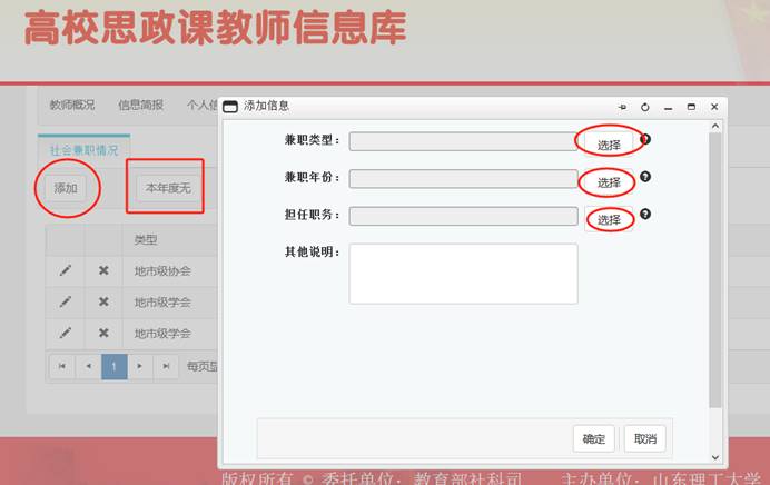 如本年度尚未参加,点击“本年度无”。 14.社会兼职情况 请根据实际参加情况依次填写,填写后请保存。添加-选择兼职类型-兼职年份-担任职务-填写其他说明-确定。