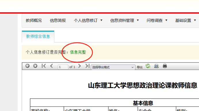 如本年度尚未参加,点击“本年度无”。 上述全部填写完整后击教师概况,页面左上角绿色字体“信息完整”,表明已经完全完成更新工作。下图所示: